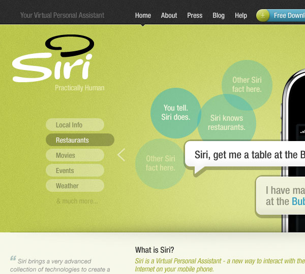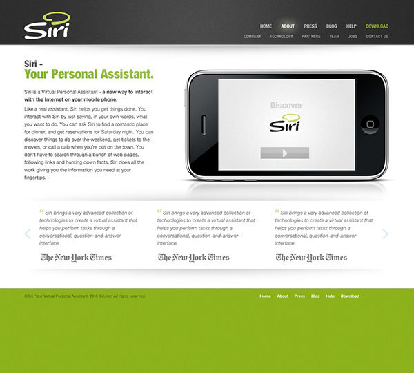 Siri’s web site is primarily a marketing tool for the product’s unique concept and capabilities but it is also a place where its growing user community can communicate with the company. To accomplish the first part of this goal, I came up with a design language that connects with the application itself, thus portraying the overall brand, and a specific set of interactions aimed at explaining what Siri is all about in just a few simple steps.